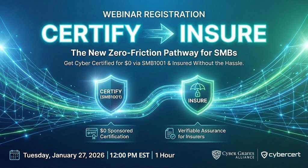 Webinar Synopsis: Certify → Insure — The New Zero-Friction Pathway for SMBs For the first time, SMBs can move from cyber certification to cyber insurance with virtually no friction — no long questionnaires, no subjective assessments, no endless back-and-forth. Thanks to the Cyber Grants Alliance (CGA) and CyberCert, SMBs can